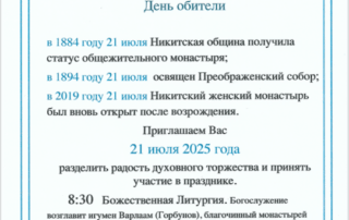 21 июля 2025 года в день Казанской иконы Пресвятой Богородицы в Никитском женском монастыре торжественно праздновался престольный праздник и день обители. в 1884 году 21 июля Никитская община получила статус общежительного монастыря; в 1894 году 21 июля освящен Преображенский собор; в 2019 году 21 июля Никитский женский монастырь был вновь открыт после возрождения. Торжественное богослужение возглавил игумен Варлаам (Горбунов), Настоятель Старо-Голутвина монастыря, благочинный монастырей Коломенской епархии. За богослужением молились Настоятельница Никитского женского монастыря игумения Магдалина (Чекулаева), Настоятельница Белопесоцкого Свято-Троицкого женского монастыря игумения Агния (Сударикова), старшая сестра подворья Пюхтицкого Свято-Успенского ставропигиального женского монастыря в Москве монахиня Даниила (Яматина), Глава городского округа …